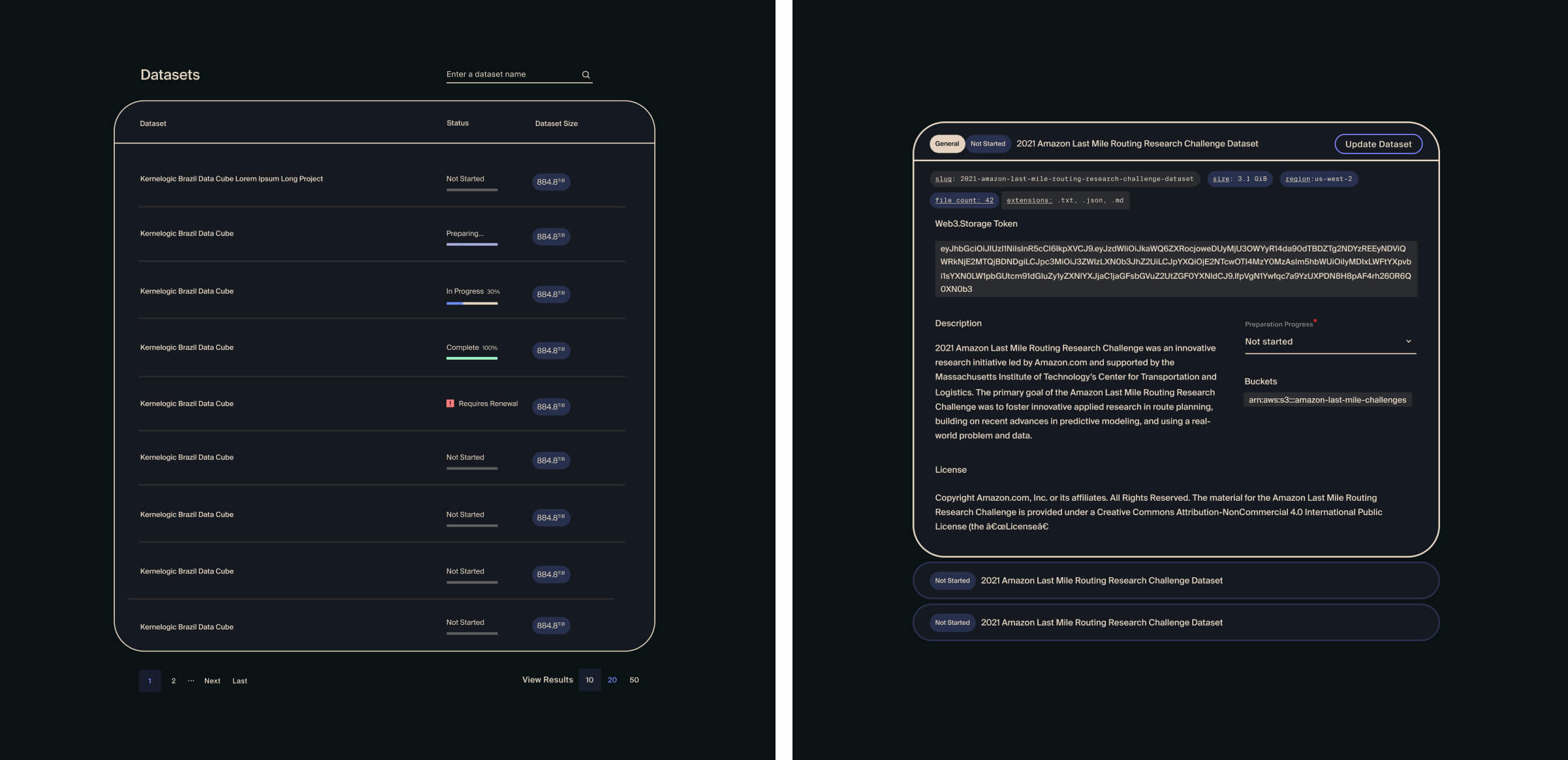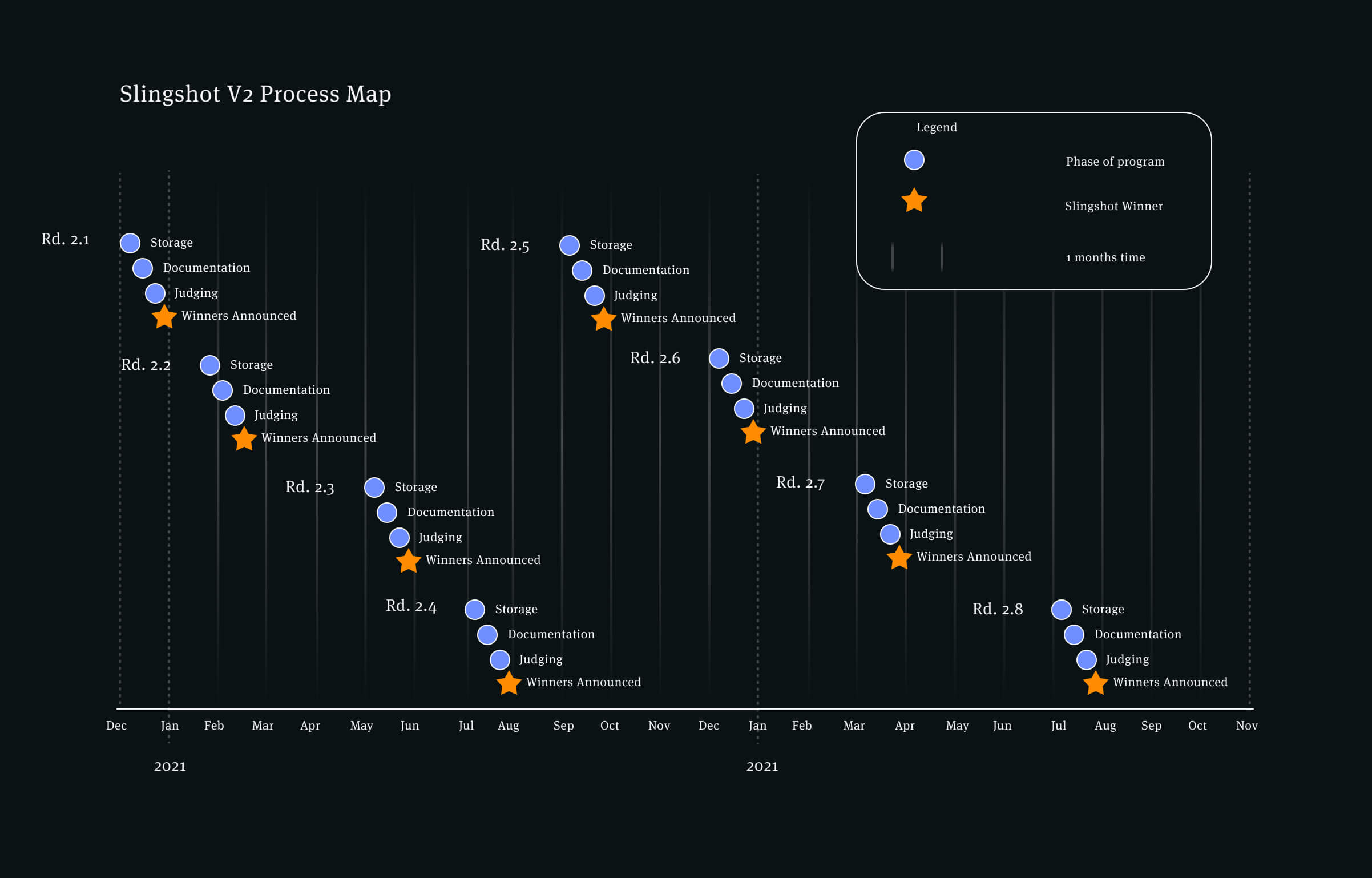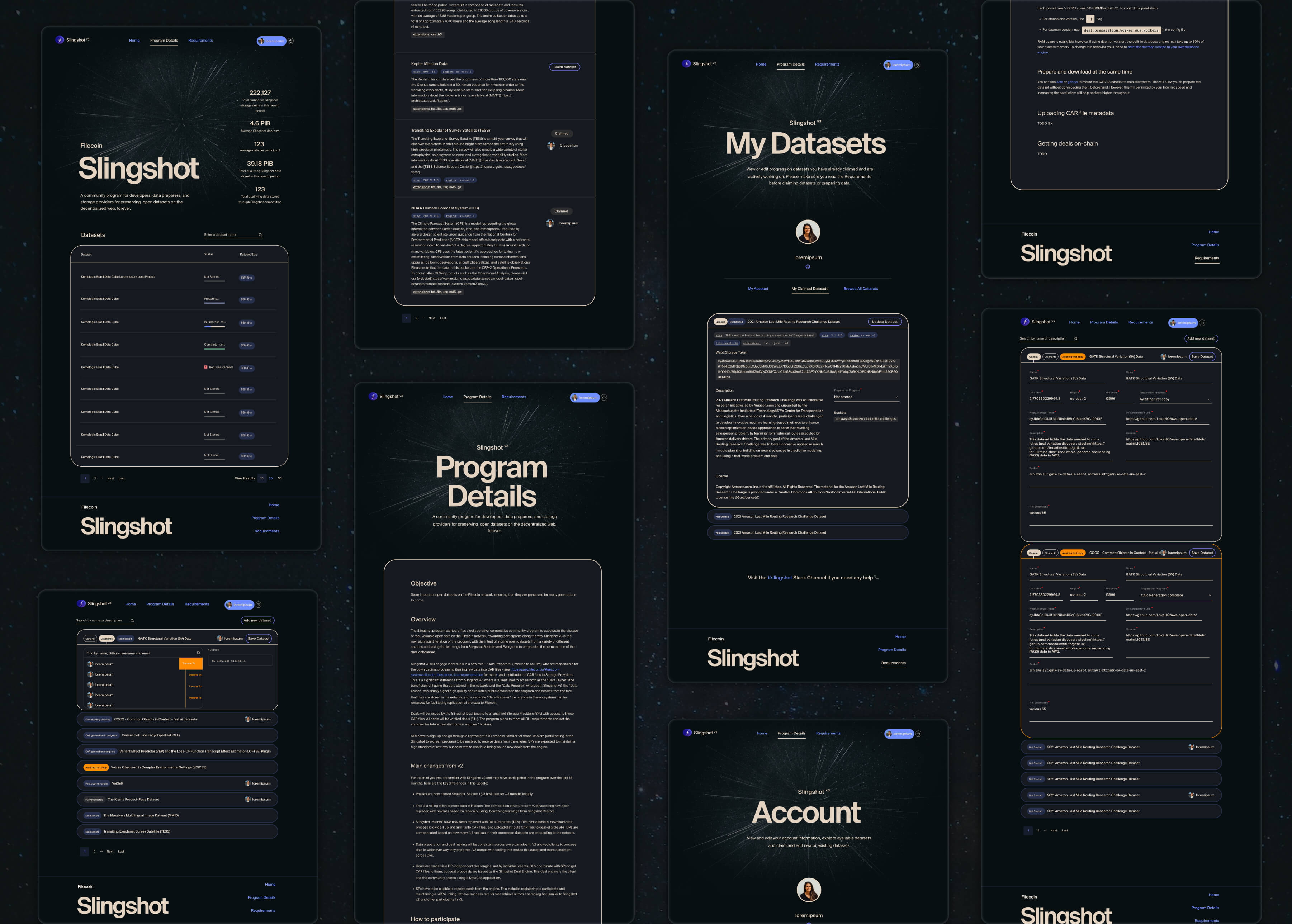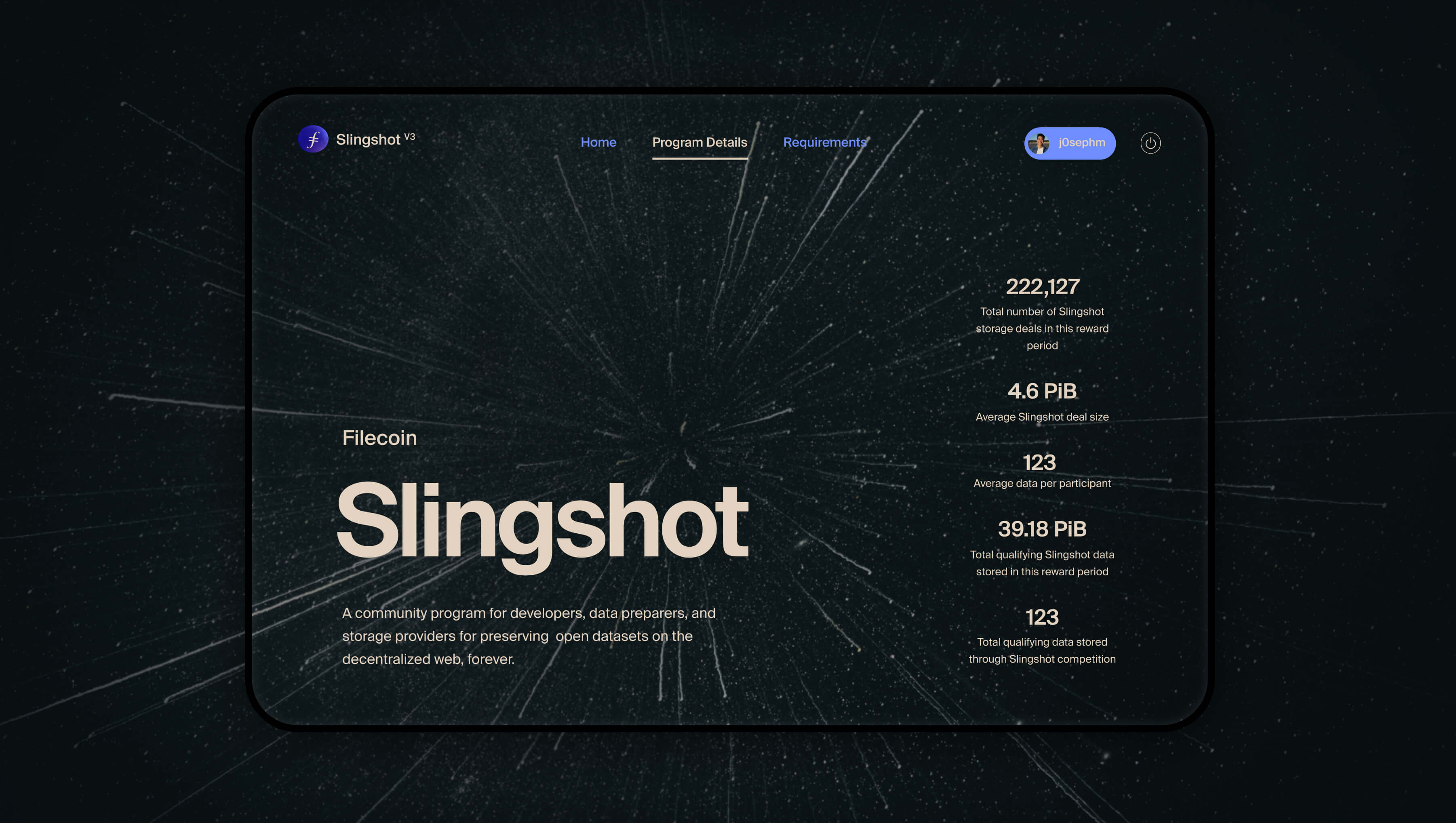 The Slingshot application began as an MVP that presented the state of a competition or race: Slingshot was part of a larger initiative called the Space Race, where participants were encouraged to store data on the Filecoin chain faster than others, with the winners in each phase receiving a reward.